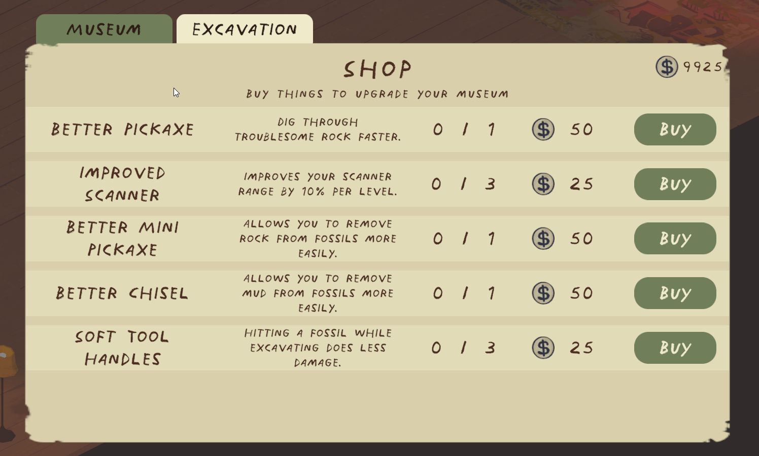 We've added an awesome new shop. Here you can buy new exhibit stands, tool upgrades and more to bring your museum to life.